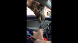 The footage, shot at Serngeti Park, Germany late last year, shows the giraffe extending its huge blue tongue to grab the woman's ice cream while she is sitting in a car with her husband and son.
