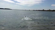 Dog swimming to fetch a ball, retrieving ball and shaking dry.