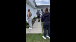 My son is a United States Marine. He was able to come home for 2 weeks prior to being deployed. He will be on several deployments over the next two years. We told his little sister that her Marine brother would not be allowed to come home before being deployed, so as you can see it was a huge surprise when he went to her Middle School classroom.She hits his arm because she was thinking he was not allowed to come home before leaving for 2 years.