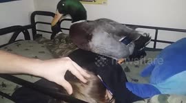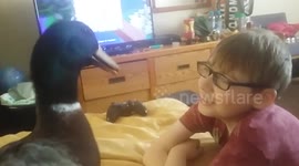 Nibbles the duck is stingy when it comes to his yummy watermelon treat and his pool. PoohBear the puppy playfully plays along.