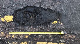 Huge potholes, whole areas with no tarmac at all. The closer you get to the kerb the worse it gets. And all the crumbled surface has collected in the gutters, meaning there's a skid risk to add to the potholes.