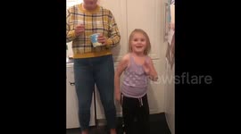 A young girl sings into her toy microphone and then her older brother comes in with a pair of light up goggles and a toy gun and bombs the video, and she pushes him over multiple times.