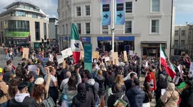 Iranian men and women shave their heads in protest against the Iranian Government next to the Churchill Statue