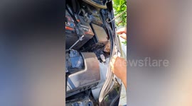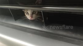 And he was left paw-struck after opening the bonnet and finding a mischievous kitty stuck in the engine with no way to escape on her own.