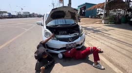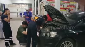 "My wife parked her car in the parking lot when the kitty cat rescue mission began," the subject told WooGlobe. "She was stuck and hardly noticeable. After 10 minutes of action, she was finally rescued unharmed."
