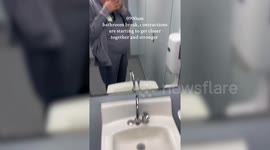After setting up her phone on the fridge, she pours some water on the floor, hunches over and begins shouting "oh my god".