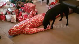 The dog then emerges from the water and runs towards the window upon hearing its name.