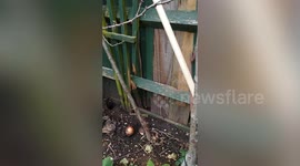 The footage then captures the bright-feathered bird falling out of the tree, flapping in distress and cowering in a corner.