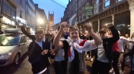 Police encounter England football fans who are celebrating the big football win against the Netherlands. At least one bottle was thrown at the police which can be heard smashing on the ground.