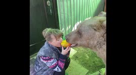 A tame bear named Tom poses with his owner Pavel for a cute photoshoot.