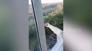 Video shows holding a piece of meat outside her apartment window and within seconds the large black bird can be seen grabbing the meat straight from her hand.