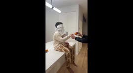 The prank escalates as, before removing the blindfold, the pranksters show him their dog's rear, lifting its tail to add to the illusion.