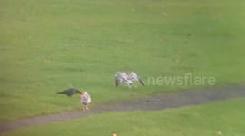 It's a crow playing with a ball in the middle of a field in front of seagulls who are probably thinking about eating the ball.