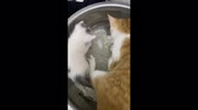 This is the amusing moment a mother cat anxiously tried to teach her kitten to use a litter box in China.