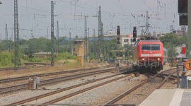 Schwerer Güterzug bei der Abfahrt im Bahnhof Rosenheim