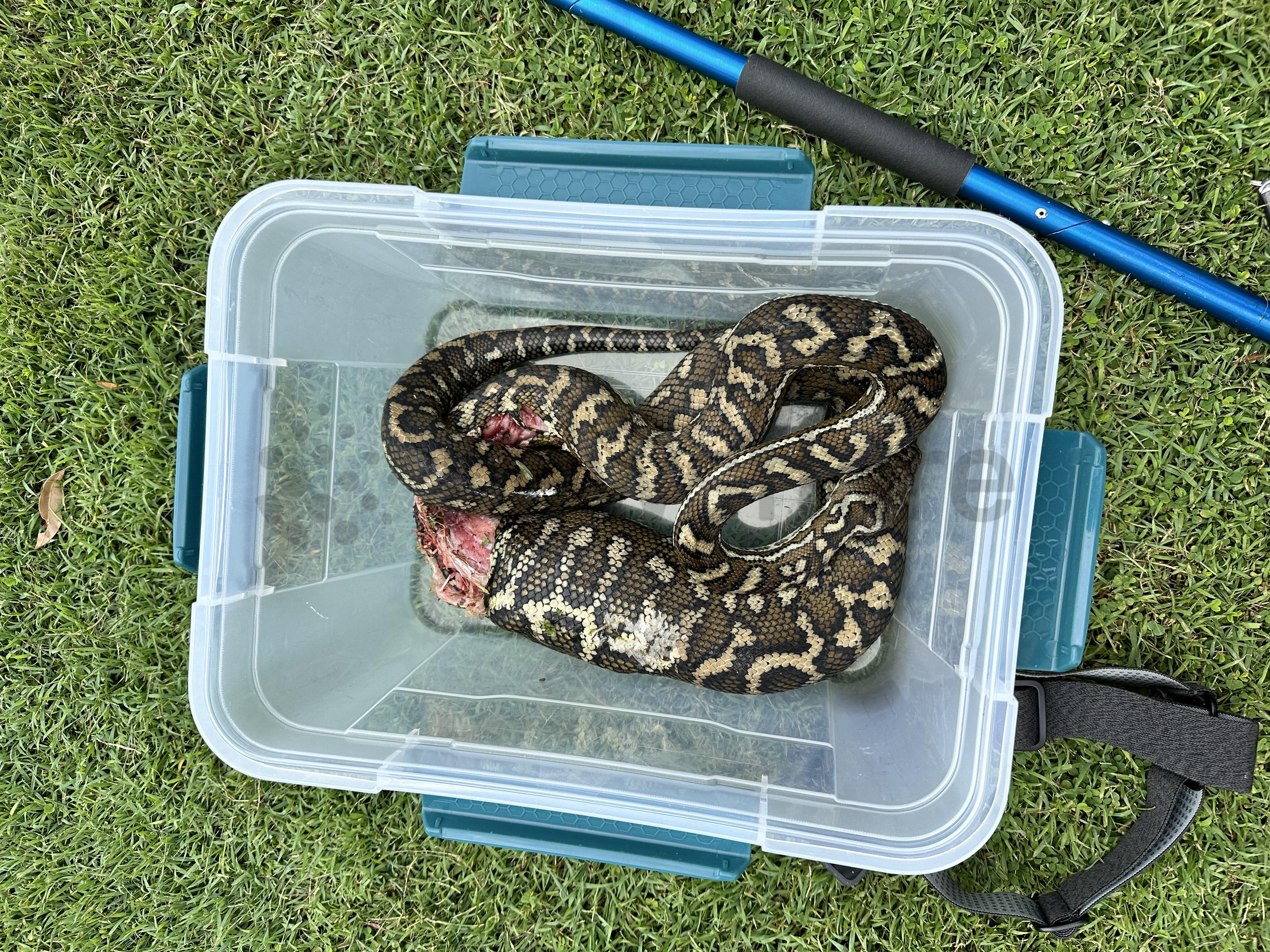 This Coastal Carpet Python was hiding in the long grass of a vacant block digesting a recent feed. The block was being tidied up and the gardener simply didn’t spot the concealed animal. A member of the public stayed with the animal until I arrived and was able to contain it and transport to a veterinarian. You can see the snake is very defensive and obviously in pain.