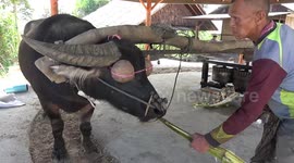 Footage shows the freshly harvested crop plunging from the stack of crops and hitting the vehicle in Loei, Thailand on January 30.